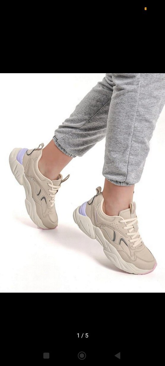 Bej renkte, platform topuklu ve bağcıklı kadın spor ayakkabısıdır. Spor ve sokak tarzı için kauçuk tabanlı, gri detaylı ve düz dokuludur.