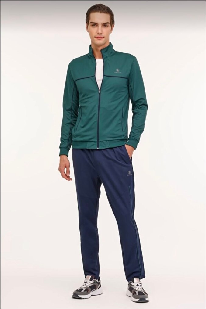 Yeşil ve lacivert parlak sentetik kumaştan eşofman takımı. Sıfır ürün.