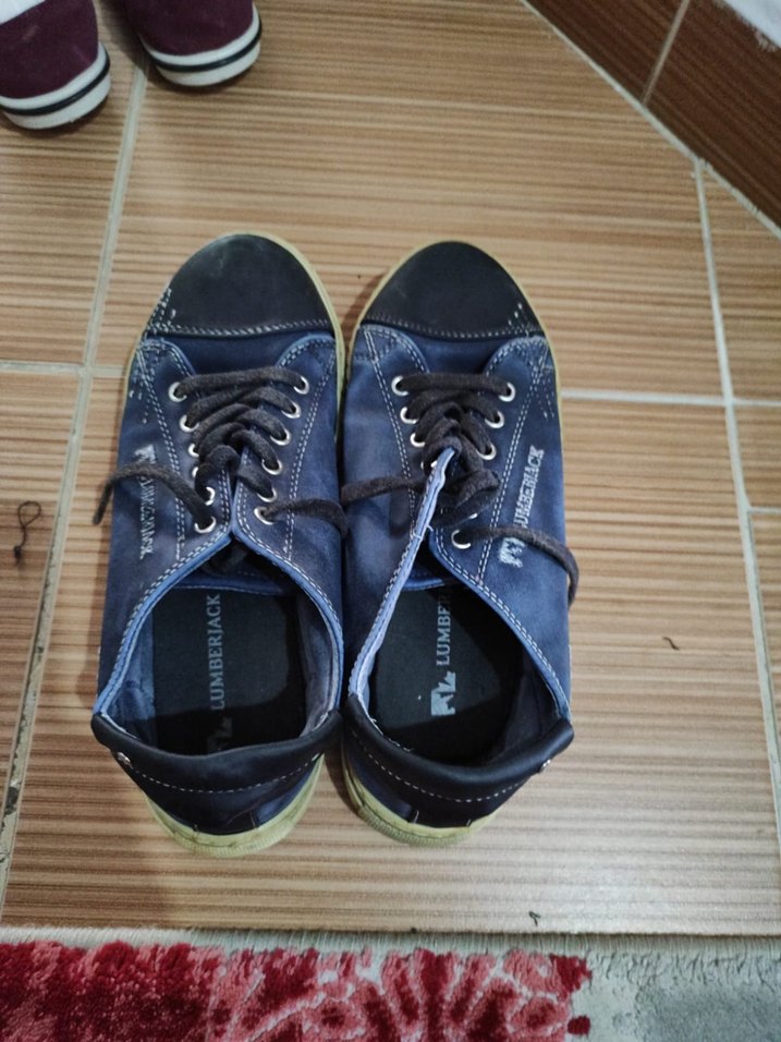 Lumberjack markalı, bağcıklı, gri ve mavi renklerde erkek spor ayakkabısı. Kauçuk tabanlı, günlük ve athleisure stil için uygun.