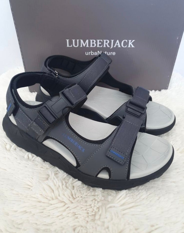 Lumberjack markalı gri erkek sandaletler, ayarlanabilir tokalı kayışlar ve dayanıklı kauçuk taban ile dış mekan sokak stiline uygundur.