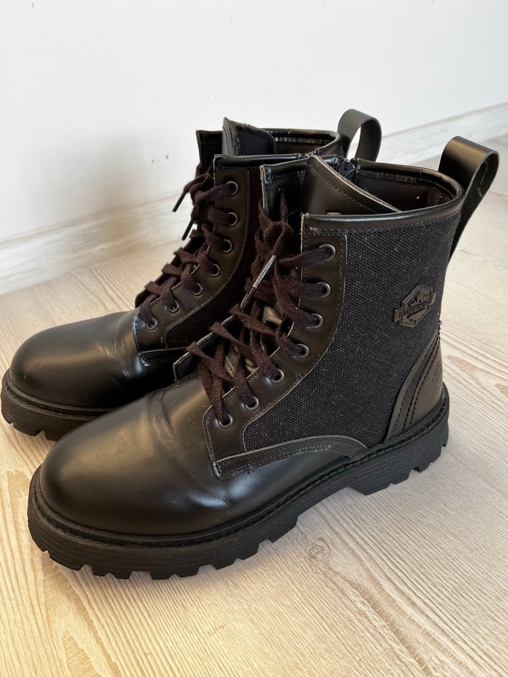 Siyah deri, yüksek topuklu bağcıklı biker bot. Trend sokak stili için uygun, desensiz ve koyu tonlarda günlük kullanıma uygun.