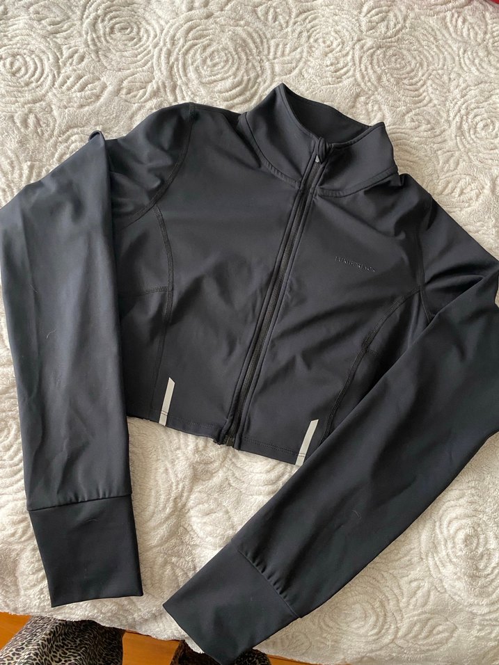 Siyah, fermuarlı, yüksek yakalı ve uzun kollu kadın ceketi. Düz, normal boyda ve günlük kullanıma, spora uygun. Sokak stili için ideal.