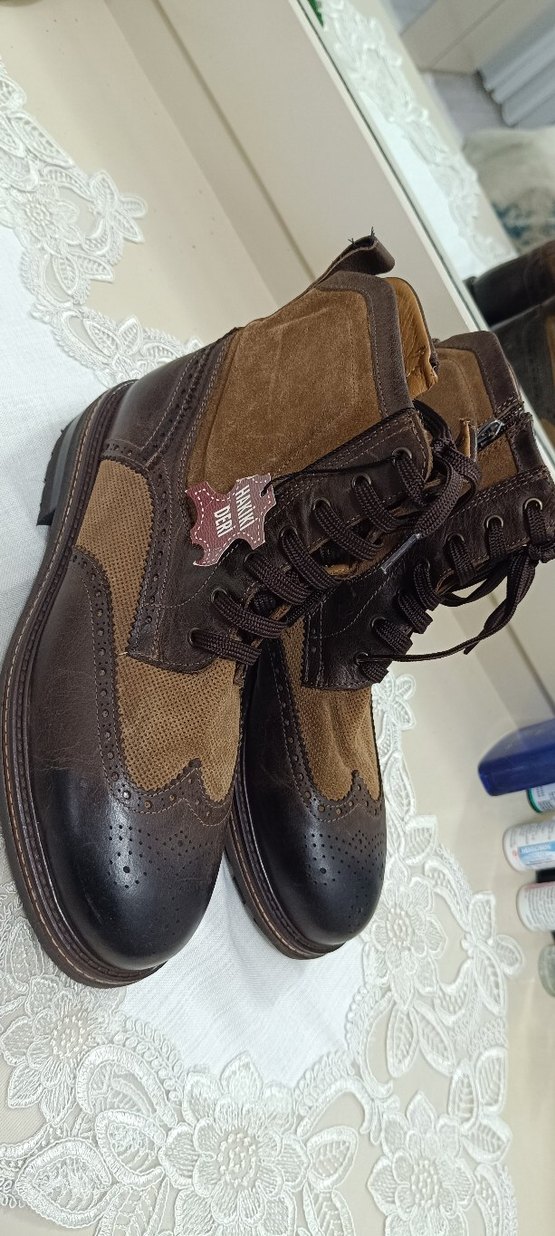 Koyu kahverengi süet ve bağcıklı tasarıma sahip erkek biker botları, günlük sokak stili için uygun.