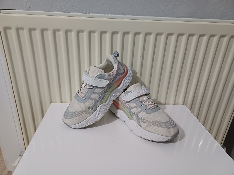 Gri ve beyaz tie-dye desenli, bağcıksız ve cırt cırtlı kız çocuk spor ayakkabısı, rahat kauçuk tabanlıdır. 34 numara 21.6cm temiz hata kusur yok