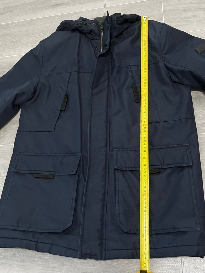 Erkekler için lacivert kapüşonlu, uzun kollu, çok cepli günlük kullanıma uygun mont. Kollarının iç kısmında kullanıma bağlı deformasyon vardır. Tamir edilebilir. Başka bir montum olduğu için kullanmıyorum. Başka bir sıkıntısı yoktur.