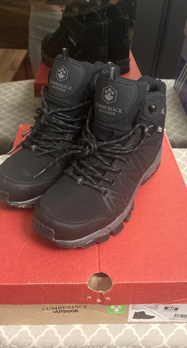 Lumberjack markalı siyah outdoor botlar, lastik tabanlı ve tokalı tasarıma sahip, sokak stili ve günlük dış mekan kullanımı için uygundur.