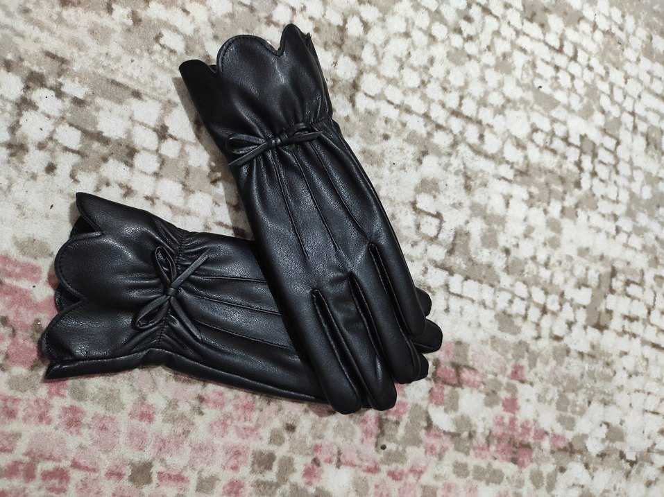 siyah deri kadın eldivenleri, rahat ve gotik tarzda. Fiyonk süslemeli, yumuşak ve sıcak iç yüzeye sahip. sıfır kullanılmamış ürün