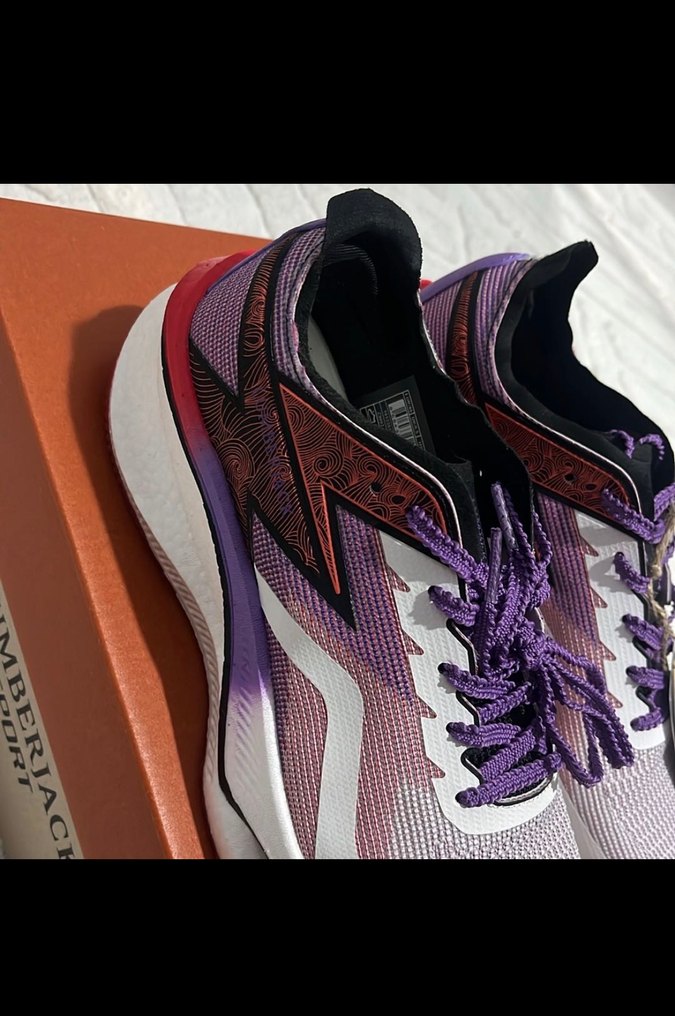 Mor renkli, bağcıklı ve koyu tie-dye desenli spor ayakkabılar, Sokak stilini sportif detaylarla birleştirir.