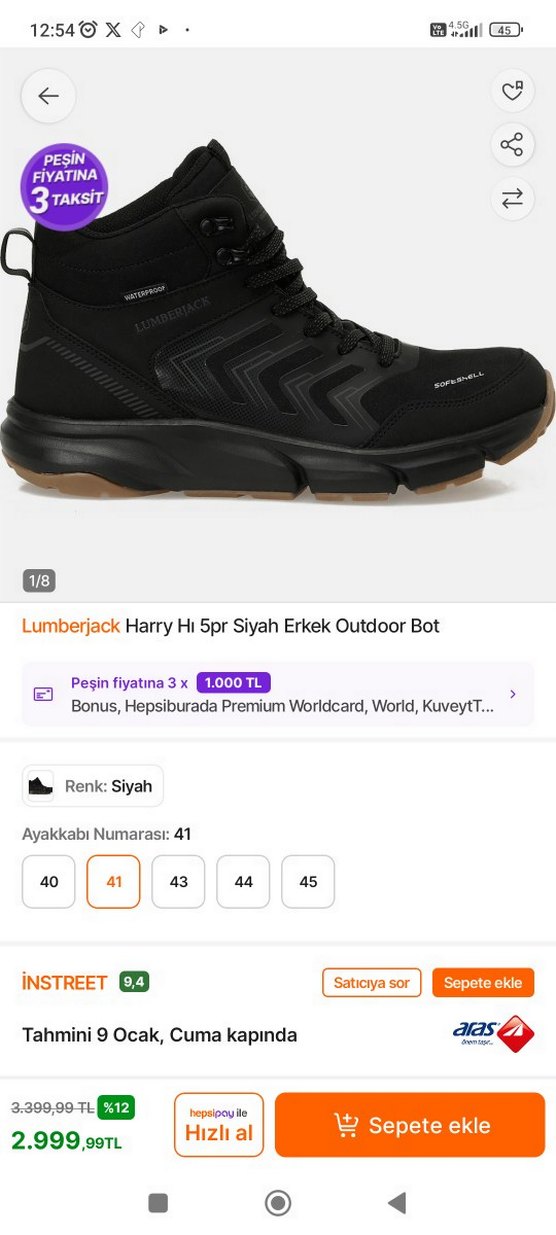 Lumberjack waterprof bot 41 numara 27.2 cm 2-3 defa giyildi ayağımı sıktığı için satıyorum sol burun kısmıni bir yere vurdum iz yaptı harici sıfır sayılır
