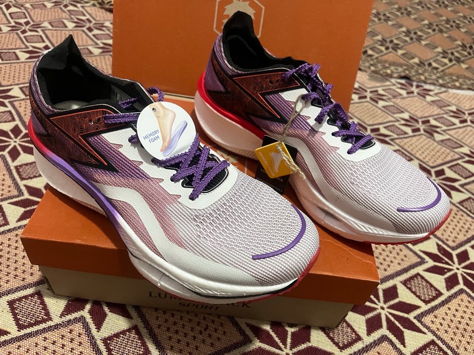 Bağcıklı, baskılı desenli mor renkli spor ayakkabılar. İnce topuklu ve kauçuk tabanlı, trend sokak stili için uygun.