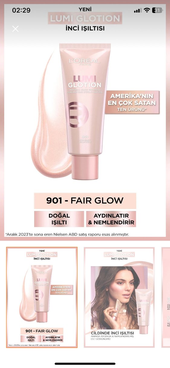 901 Fair Glow renkli Lumi Glotion, doğal ışıltı sağlayarak ten rengini aydınlatır ve nemlendirir. Yarısından fazlası duruyor