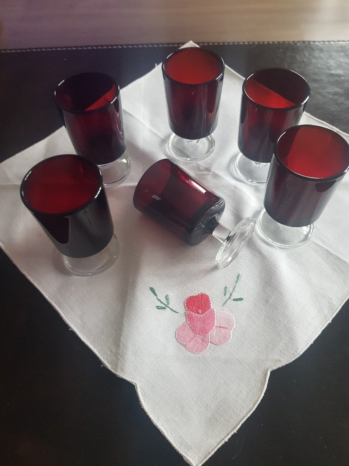 Fransiz luminac Koyu bordo renkte, şeffaf ayaklı cam likor seti. Dayanıklı taban ve pürüzsüz yüzeye sahip. İçecek sunumu için uygundur. Kusursuzdur