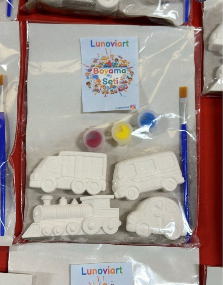 Lunoviart boyama seti, araç figürleri, temel renklerde boyalar ve fırça içerir.