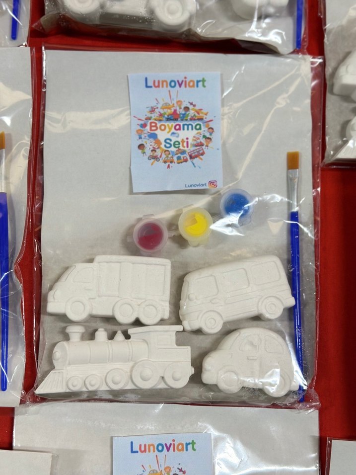 Lunoviart boyama seti, araç şekilli dört alçı figür, üç ana renk boya ve fırça içerir, yaratıcı etkinlikler için uygundur.