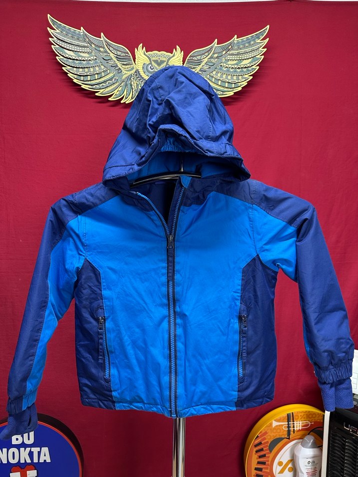 Mavi kapüşonlu, fermuarlı cepli erkek çocuk montu, yumuşak ve sıcak kumaştan, desen içermeyen renkli sokak stiliyle. Ürünümüz Avrupa gayet iyi durumda 5 yaş outdoor tarzı rüzgarlık mont kol kısmında ufak bir defo mevcuttur resimlerde mevcuttur