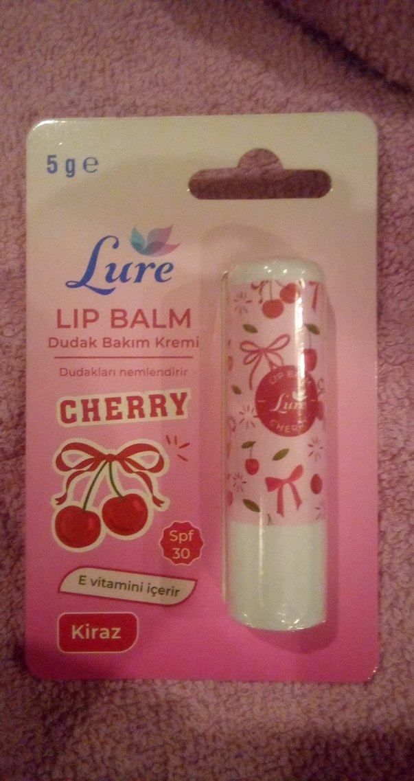 Lure kiraz aromalı dudak balmı, E vitamini ve SPF 30 içerir. Dudakları nemlendirir, pastel pembe ambalajda sunulur.