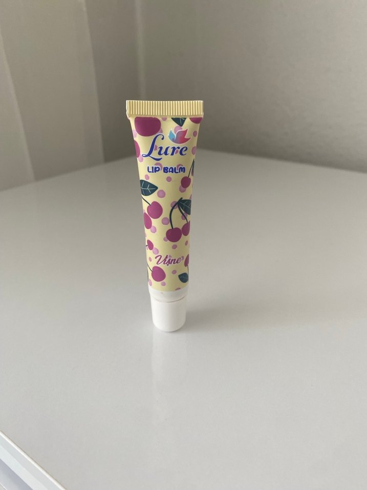 Lure Nure dudak balmı, kiraz desenli pastel beyaz ambalajda, dudakları yumuşak ve nemli tutar.