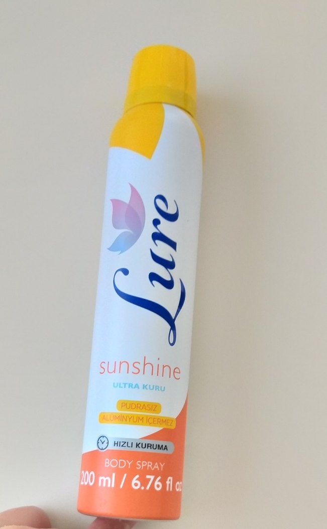 Lure Sunshine kadınlar için pudrasız, alüminyum içermeyen ve hızlı kuruyan vücut spreyi, 200 ml boyutunda. Roll on bittiğinde internetten toplu sipariş vermiştim gelmelerini beklerken bunu almıştım günü kurtarmak için. Sayılı sıkmışımdır benimkiler gelince bıraktım duruyordu kullanmıyorum. Satmaya karar verdim. Son kullanma tarihi 2029. Alabilirsiniz.