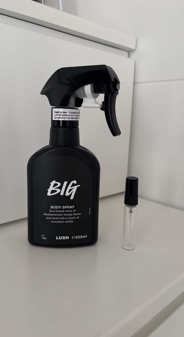 LUSH BIG vücut spreyi, Akdeniz portakal çiçeği, neroli ve vanilya dokunuşlu narenciye kokusuna sahiptir. Lush’ın en çok satılan body mistlerindendir, 5ml dekant fiyatıdır.