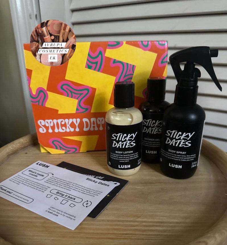 Tüm ürünlerimiz orijinal ve Londra çıkışlıdır Sıfır ve etiketli teslim edilir. Lush'ın Sticky Dates Vücut Losyonu(100g), Duş Jeli (125g)ve Vücut Spreyinden(100g) oluşan full setidir.