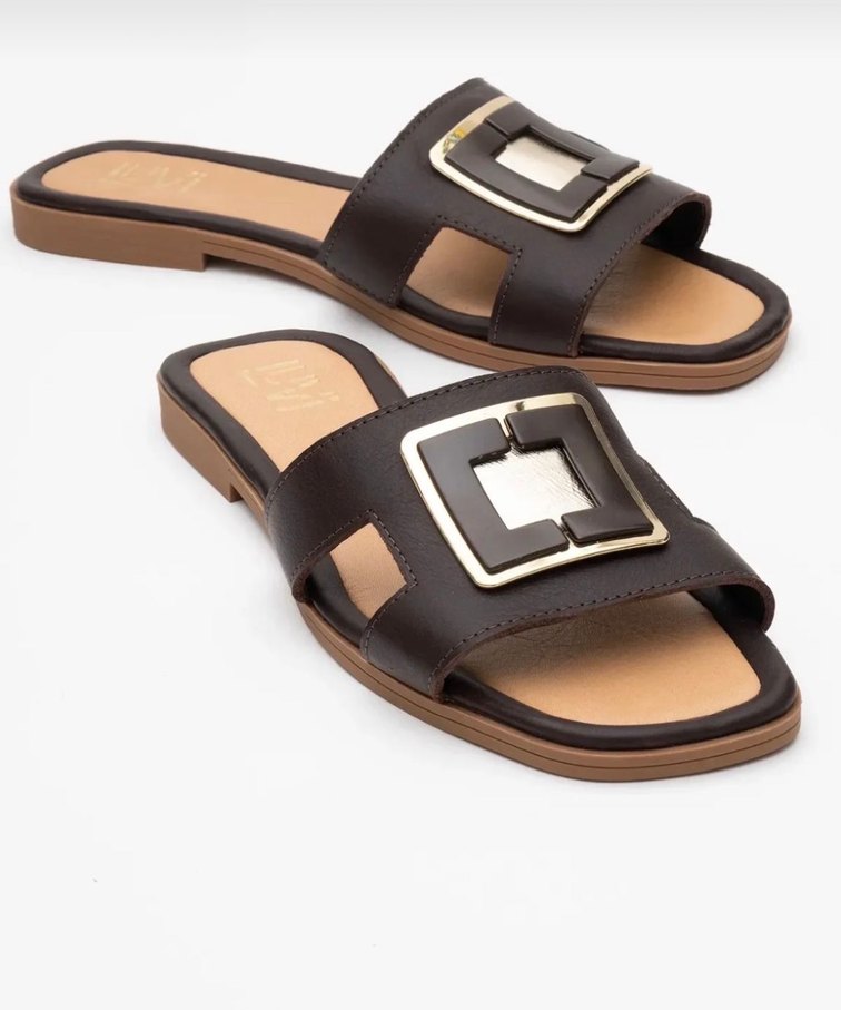 2 kere giyildi. Kahverengi deri kadın terlik, parlak kare desenli tokası ve blok topuklu. Minimalist ve çağdaş tarza sahip, günlük kullanıma uygun.