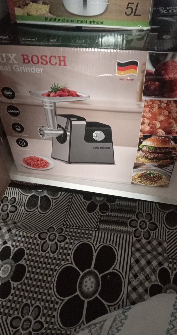 Lux Bosch gri renkli et kıyma makinesi, güçlü motoru ile etleri hızlı ve etkili şekilde kıyabilir.