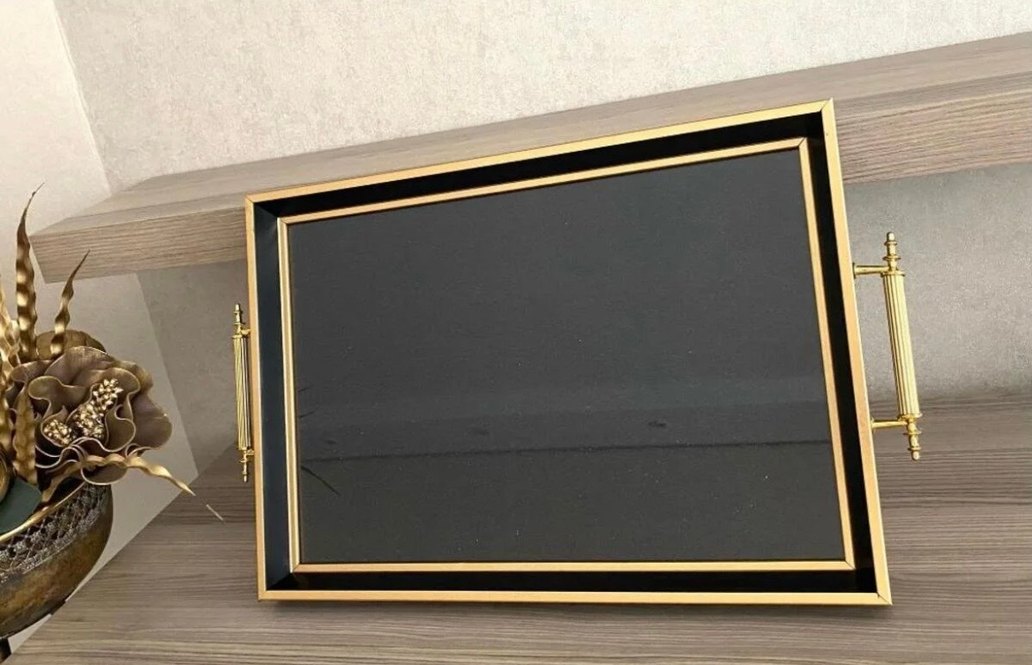 Lüx tepsi kenarları gold üstü cam, renkli kenarları olan koyu renk çerçeve, şık ve zarif bir görünüm sunar. ️
