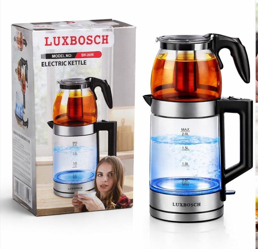 Luxbosch elektrikli çay makinesi, 2 litrelik kapasite, su seviyesi göstergeleri ve demliğiyle modern bir tasarıma sahip. Mavi ışıklı cam ve paslanmaz çelik kullanılmış. ☕çaycı Cam kettle üst hazneye 800 milim at ağzına 2 litre kaynadıktan sonra otomatikman kendini kapatır ekstra LED ışıklıdır bu yüzden görünüşü mükemmeldir 2000 watt'tır çok çabuk ısıtıyor kapalı kutu ithal üründür sağlam bir şekilde paketlenip kargoya teslim edilir
