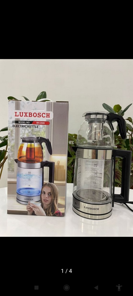 LUXBOSCH elektrikli çay makinesi, siyah saplı cam gövde ve üstte ayrı demleme haznesi ile işlevsel ve şık bir tasarıma sahiptir. Ölçü işaretleri ve paslanmaz çelik taban bulunur. ☕