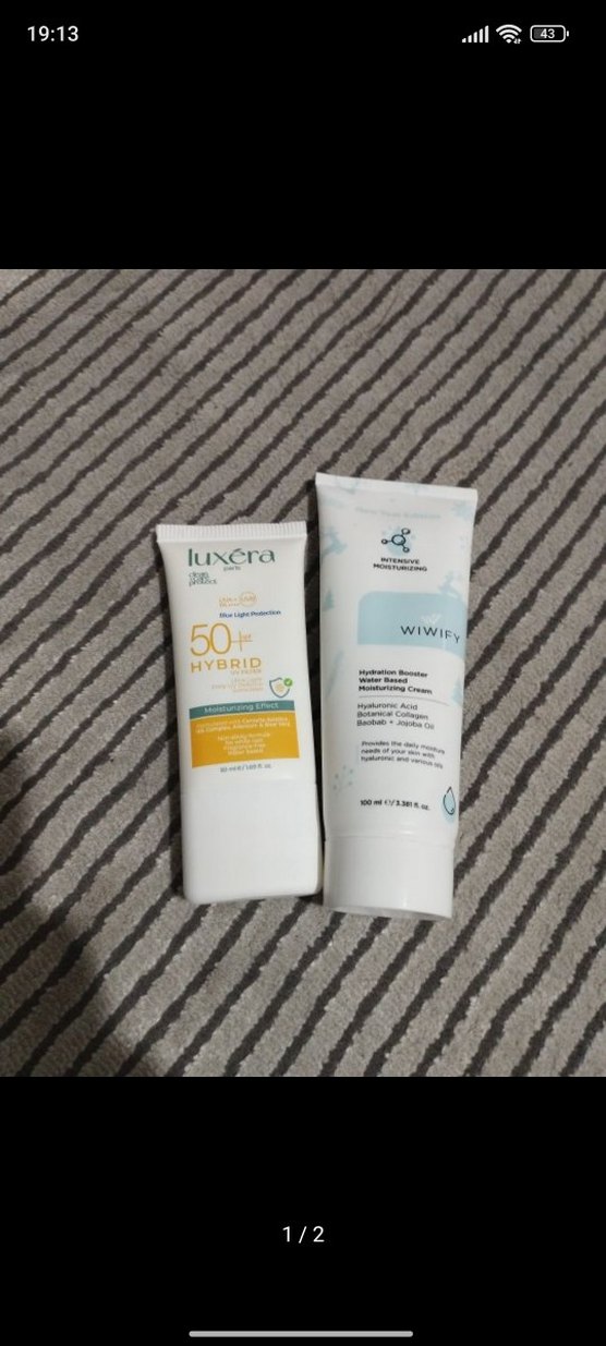 Luxera SPF 50+ hibrit güneş koruyucu UV ışınlarına karşı koruma sağlar. Wiwie hyaluronik asit içeren nemlendirici ciltte nemlendirir ve rahatlatır. ☀️
