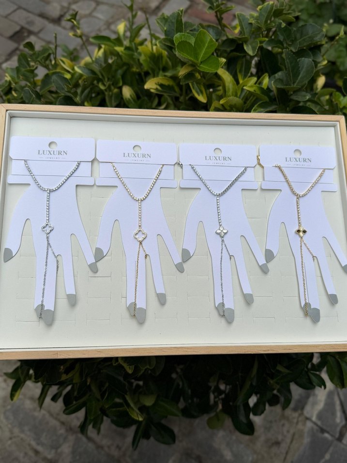 LUXURN markalı, zincir detaylı ve nakış desenli açık renk kadın el zincirleri, günlük kullanım için minimal ve çağdaş tarzda. ✨