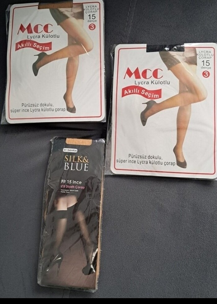 Lycra Külotlu Çorap 3 paket birlikte Siyah renk ve ten rengi külotlu çorap, ten rengi diz altı corap hiç açılmamış üç paket birden. 3 numara 15 denge. Dizaltı çorap fit 15 ince.