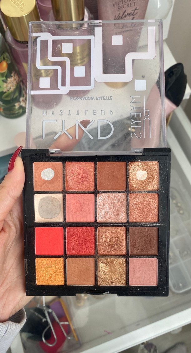 Kırmızı ve kahverengi tonlarda 16 renkli, mat ve ışıltılı göz farı paleti.