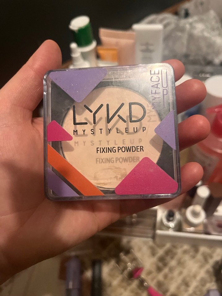 LYKD sabitleyici pudra, açık bej tonunda, makyajı sabitlemek için pürüzsüz bir bitiş sağlar. Renkli geometrik desenli kompakt kutuda. Gratis