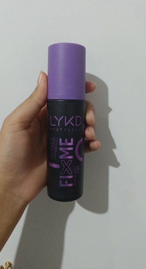 LYKD marka mor kapaklı makyaj bazı ve sabitleyici sprey, makyajın kalıcılığını artırır. Şişede 'FIX ME' ve 'LYKD' yazıları bulunur.