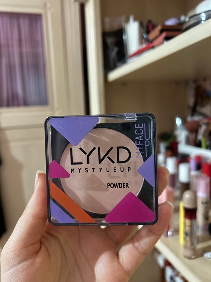 LYKD MYSTYLEUP açık bej tonunda yüz pudrası, pürüzsüz bitişli. Renkli geometrik detaylara sahip kompakt tasarım. Ambalajda POWDER, MYSTYLEUP, LYWD yazıları bulunur.