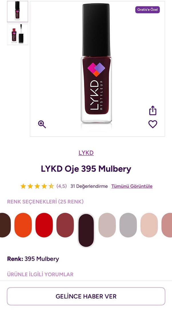 LYKD oje 395 Mulbery, koyu bordo renkte canlı ve zengin bir görünüm sunar.