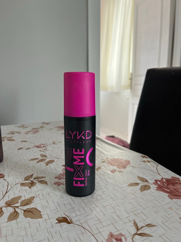 3 kere kullandım.LYKD Fix Me makyaj sabitleyici sprey, canlı pembe şişede renkli tasarım. Makyajın gün boyu kalıcı olmasını sağlar.