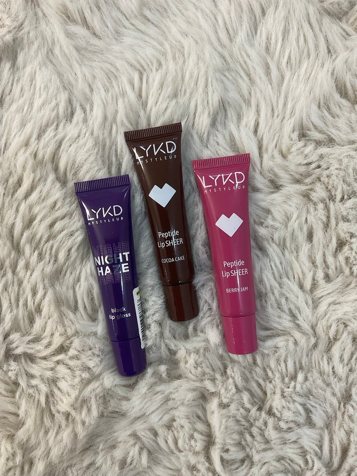 LYKD markasına ait mor, kahverengi ve pembe tonlarında üç adet koyu renkli dudak parlatıcısı bulunur. Her tüpün üzerinde ürün adı ve renk varyantı yer alır, dudaklara hafif renk ve nem sağlar.
