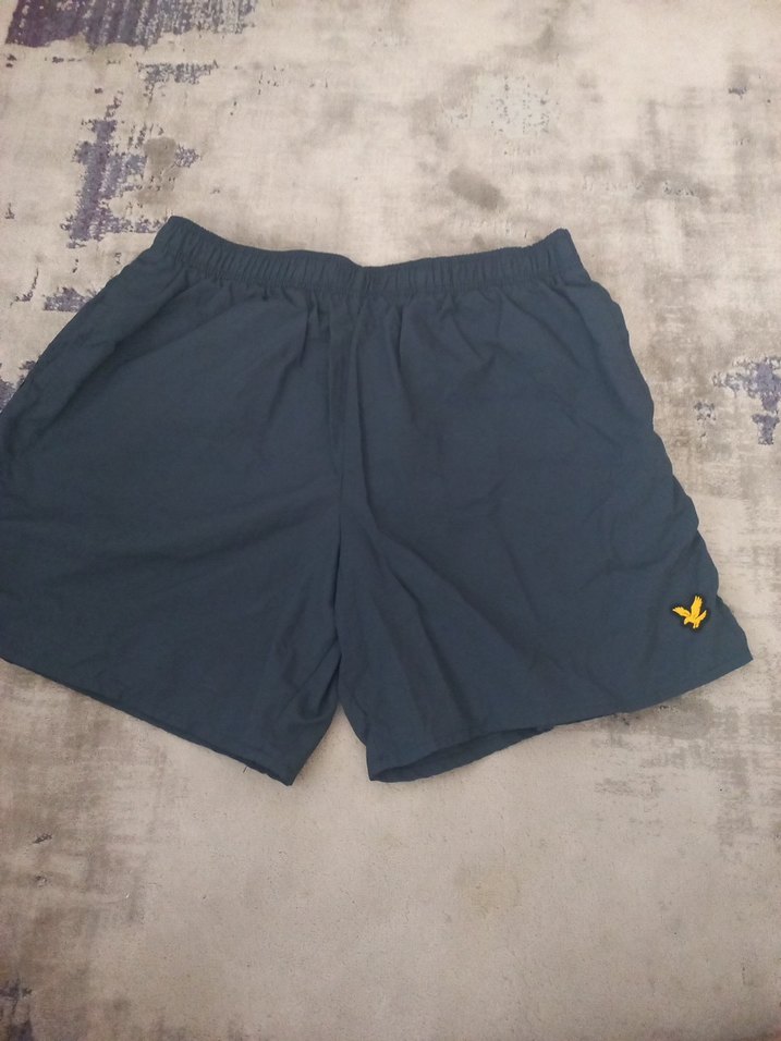 Sentetik kumaştan, bel bantlı, bol kesim ve düz mavi renkte erkek mini şort. Sokak stili ve açık hava kullanımı için uygundur.