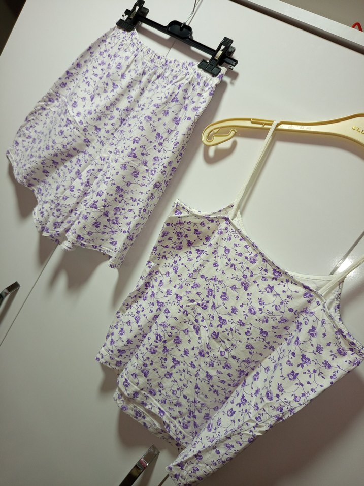 M BDN UYUMLU Mor çiçek desenli, askılı üst ve kısa şortlu bol kesim kadın pijama takımı. Bohem vintage tarzda rahat kullanım sağlar. Sadece 1 kez kısa süre giyilmiş yıkayıp kaldırıldı uymadığı için satıyorum, etiketi sökük olduğu için markası bilinmiyor