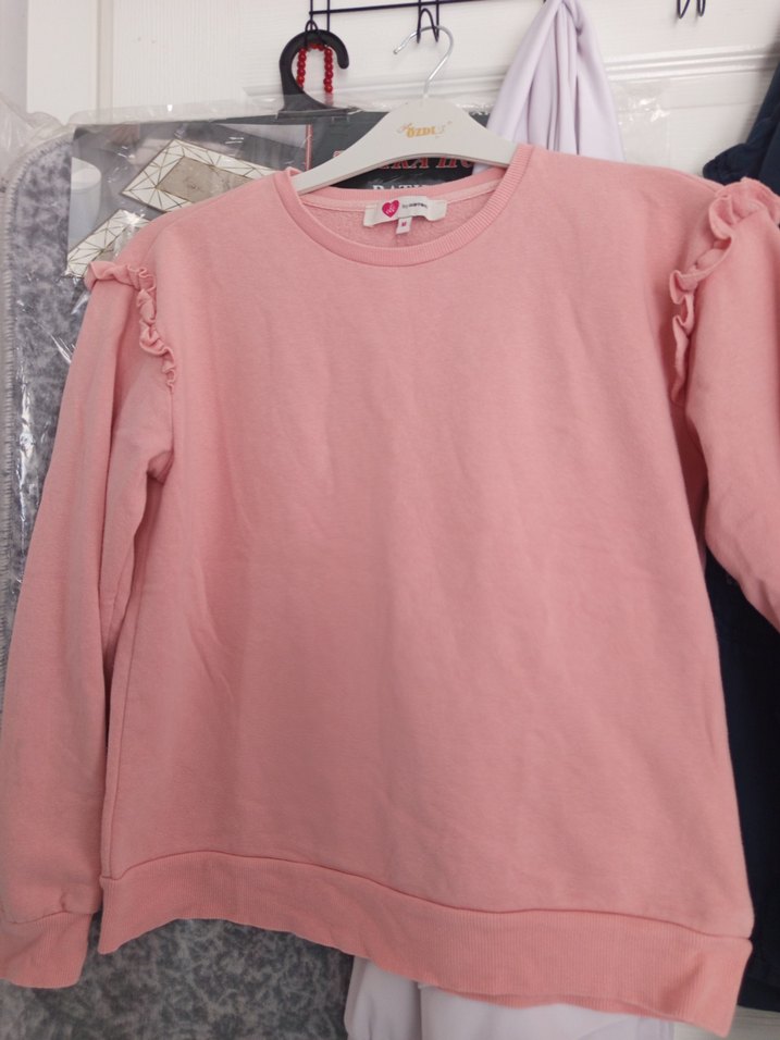 M beden pembe sweatshirt, uzun kollu ve fırfır detaylıdır. Yuvarlak yakalı, bol kesim