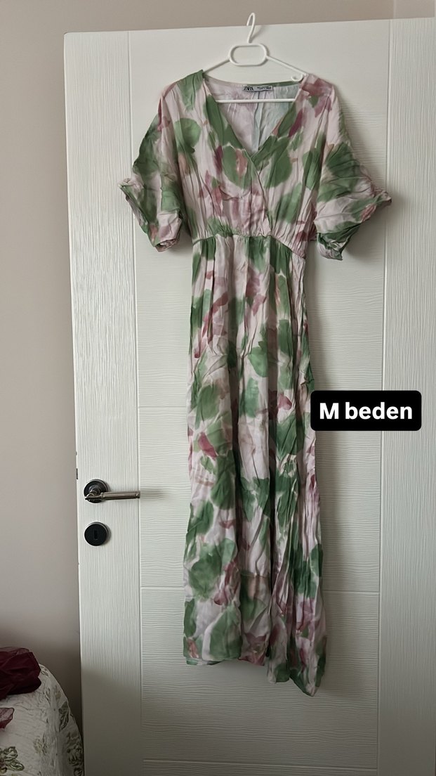 M beden, kısa kollu, bol kesim, uzun pastel tonlarda batik desenli elbise. Yumuşak sentetik kumaştan, V yakalı ve drapeli tasarım.