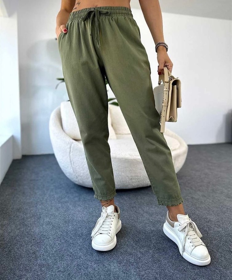 Beli Lastikli Paçası Püskül Detay Gabardin Haki Pantolon