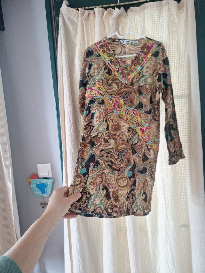 m beden india plaj kıyafeti %100 cotton kumastir hafif pulludur askıda asılı iken iki kol arasi yaklaşık 55 cm kadar esner omuzdan boy bitimi yaklaşık 82 cm dir