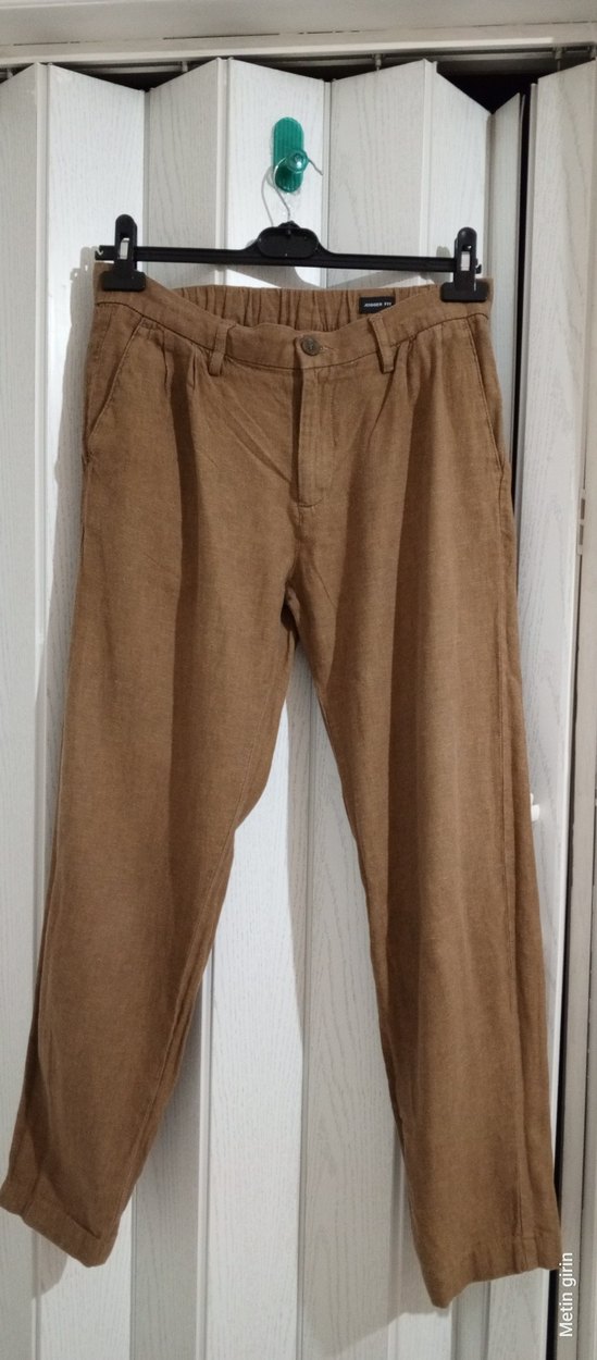 keten kumaştan, rahat kesime sahip, midi boyda günlük ve sokak stiline uygun Erkek pantolonu. Desensiz, zahmetsiz şıklık sunar. KULLANİLDİ, SADECE ARKADA MİNİK SU LEKESİ VAR. BEL ARKA LASTİKLİ 80 CM, BOY 96 CM, PAÇA ENİ 16 CM