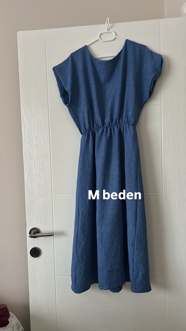M Beden Kısa Kollu Mavi Keten Midi Elbise