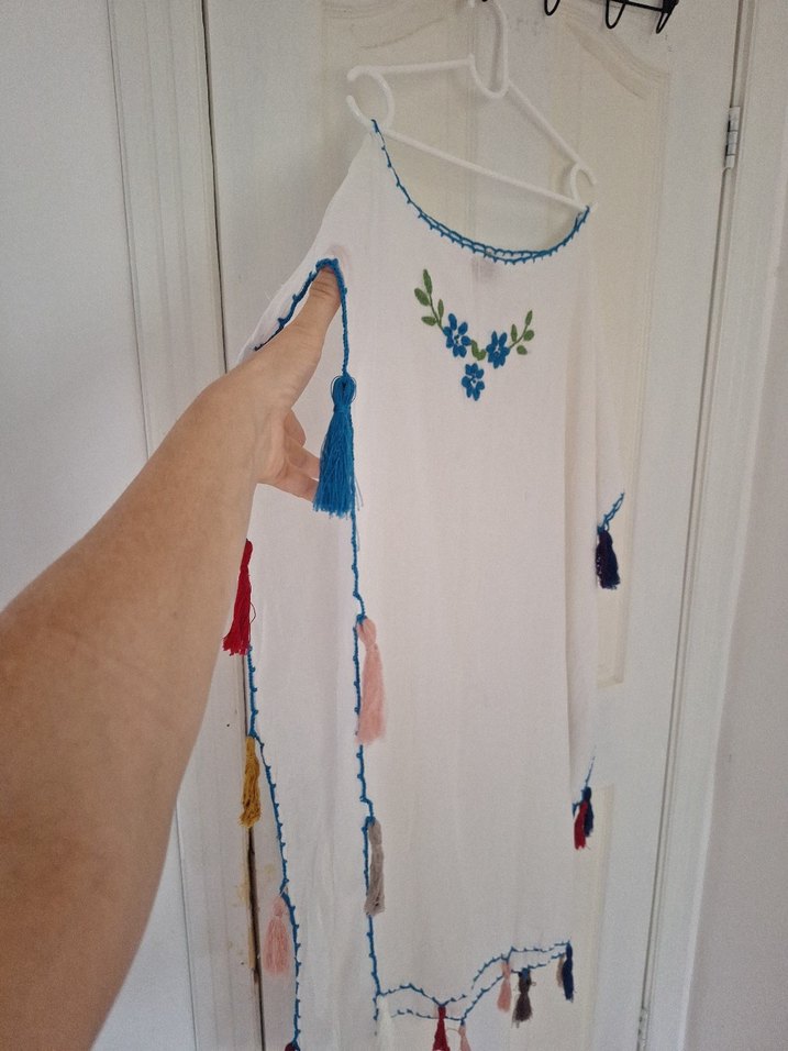 m beden pamuklu plaj kıyafeti alt etekleri yırtmaci vardir yarasa koldur pamuklu kumastir askıda asılı iken iki kol arasi yaklaşık 97 cm kadar esner omuzdan boy bitimi yaklaşık 98 cm dir rahat kaliptir yumusak kumastir nakış islemeli yanları püsküllü