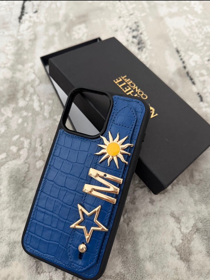 Özel yaptırmıştım siteden kontrol edebilirsiniz ben 1200 liraya aldım. Uyguna bırakıyorum çok az kullanıldı . Aksesuarları tekli de takabilirsiniz. Lacivert renkli, dokulu yüzeye sahip telefon kılıfı üzerinde tokalı ve altın renkli güneş, yıldız ve M harfi süslemeleri bulunur. Street wear tarzına uygundur.