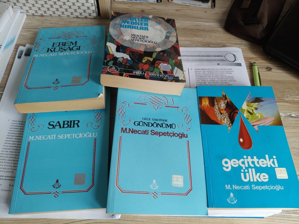 M. Necati Sepetçioğlu'nun "Gece Vaktinde Gündönümü" ve "Diller Yediler Kırkılar" kitaplarını içeren üniversite kitapları seti.